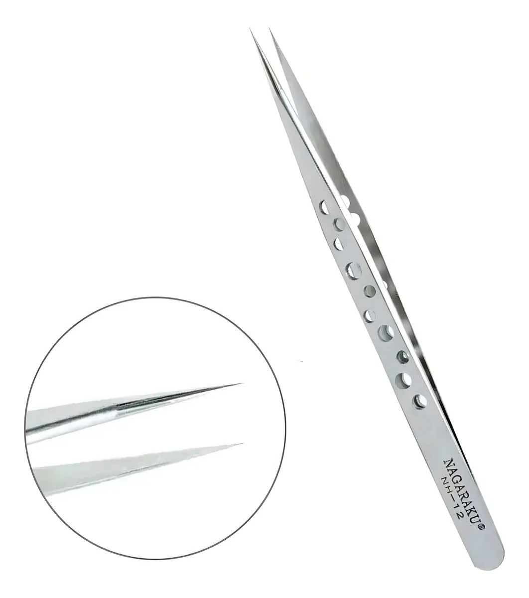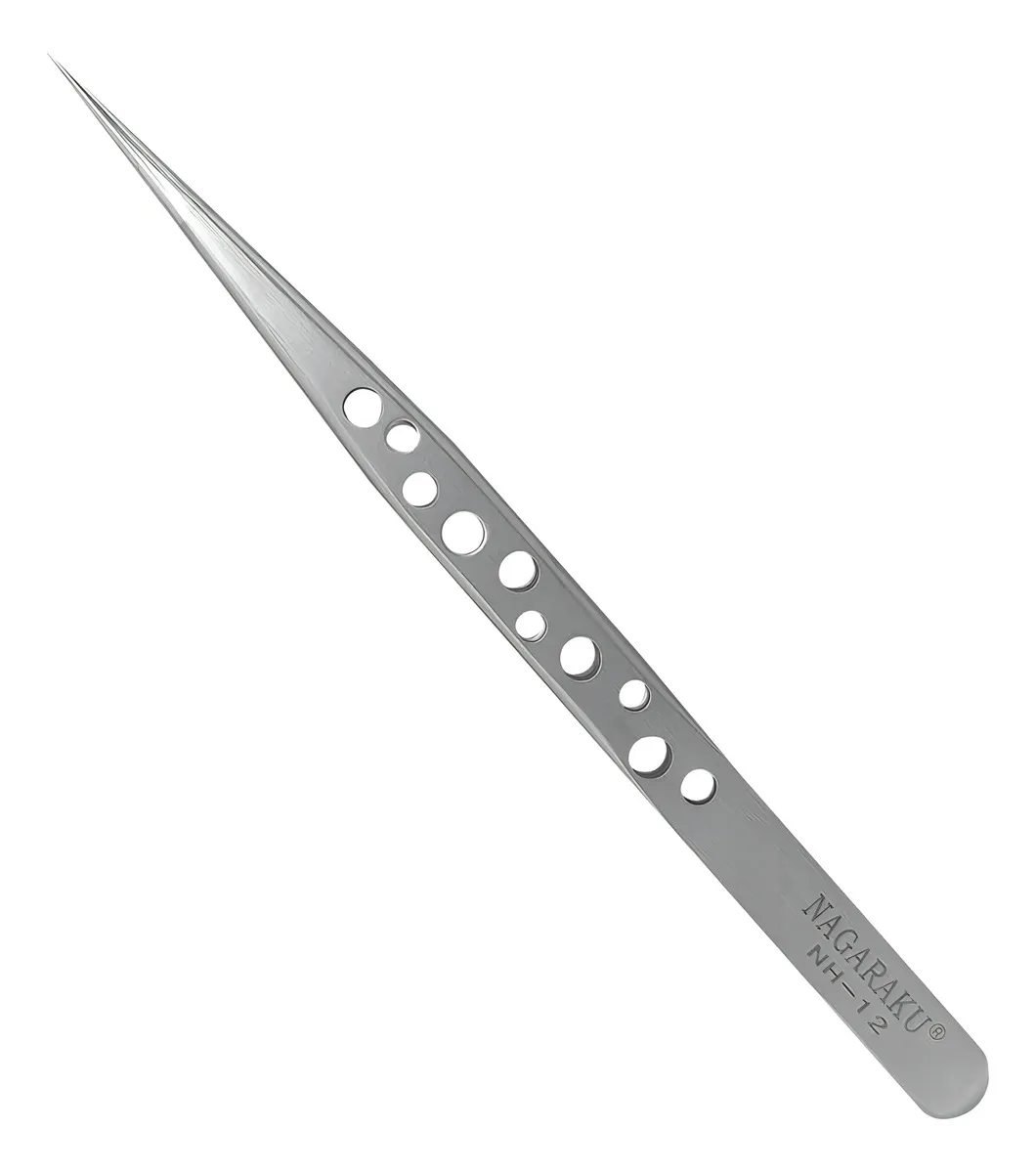 Pinça Nagaraku NH-12 Prata com acabamento matte que inibe reflexos durante procedimentos de extensão de cílios. Projetada para agilidade na montagem de fans e adequada para técnica de fio a fio devido à ponta fina e alta precisão.