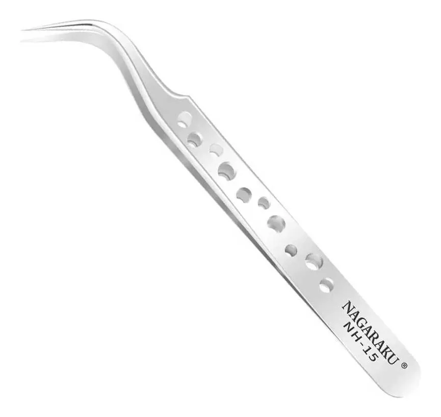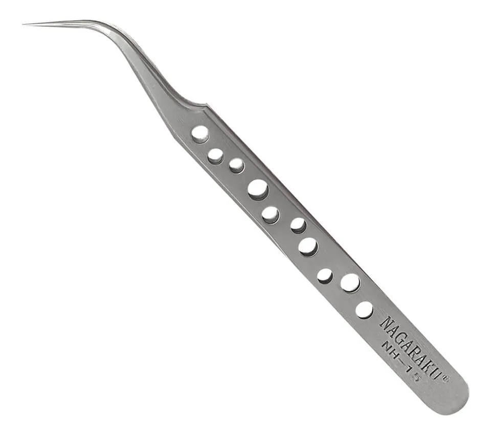 Pinça Nagaraku NH-15 Prata ponta curva com acabamento matte, projetada para agilidade na montagem de fans e adequada para técnica de fio a fio devido à ponta fina e alta precisão.